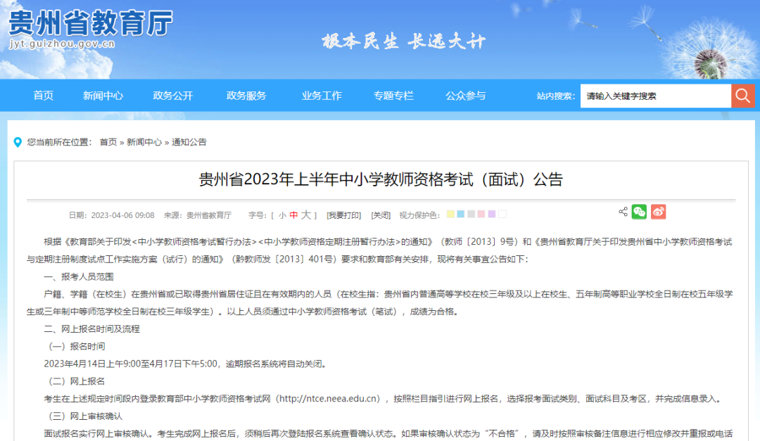 贵州省2023年上半年中小学教师资格考试面试即将开始,面试时间为:2023年5月13日至14日,面试成绩公布日期为:2023年6月14日。