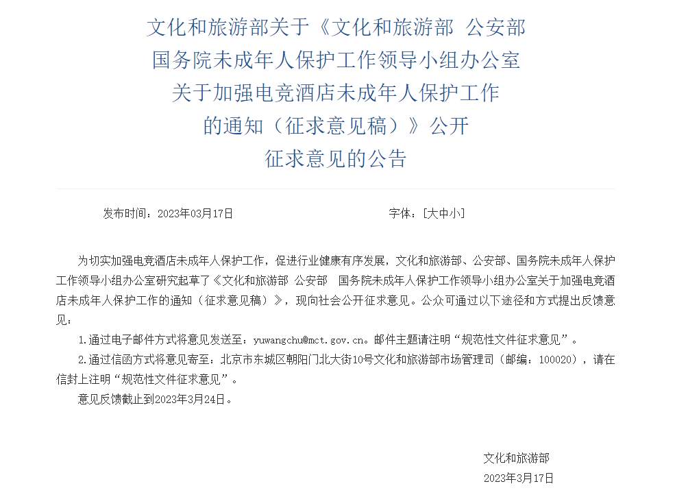 文化和旅游部等多部门就加强电竞酒店未成年人保护工作公开征求意见。拟规定:①电竞酒店应设未成年人禁入标志,在消费者入住等环节明确告知不接待;②电子商务平台经营者不得允许持未成年人身份证预定电竞房;③电竞酒店经营者应设置禁止未成年人登录计算机的功能。