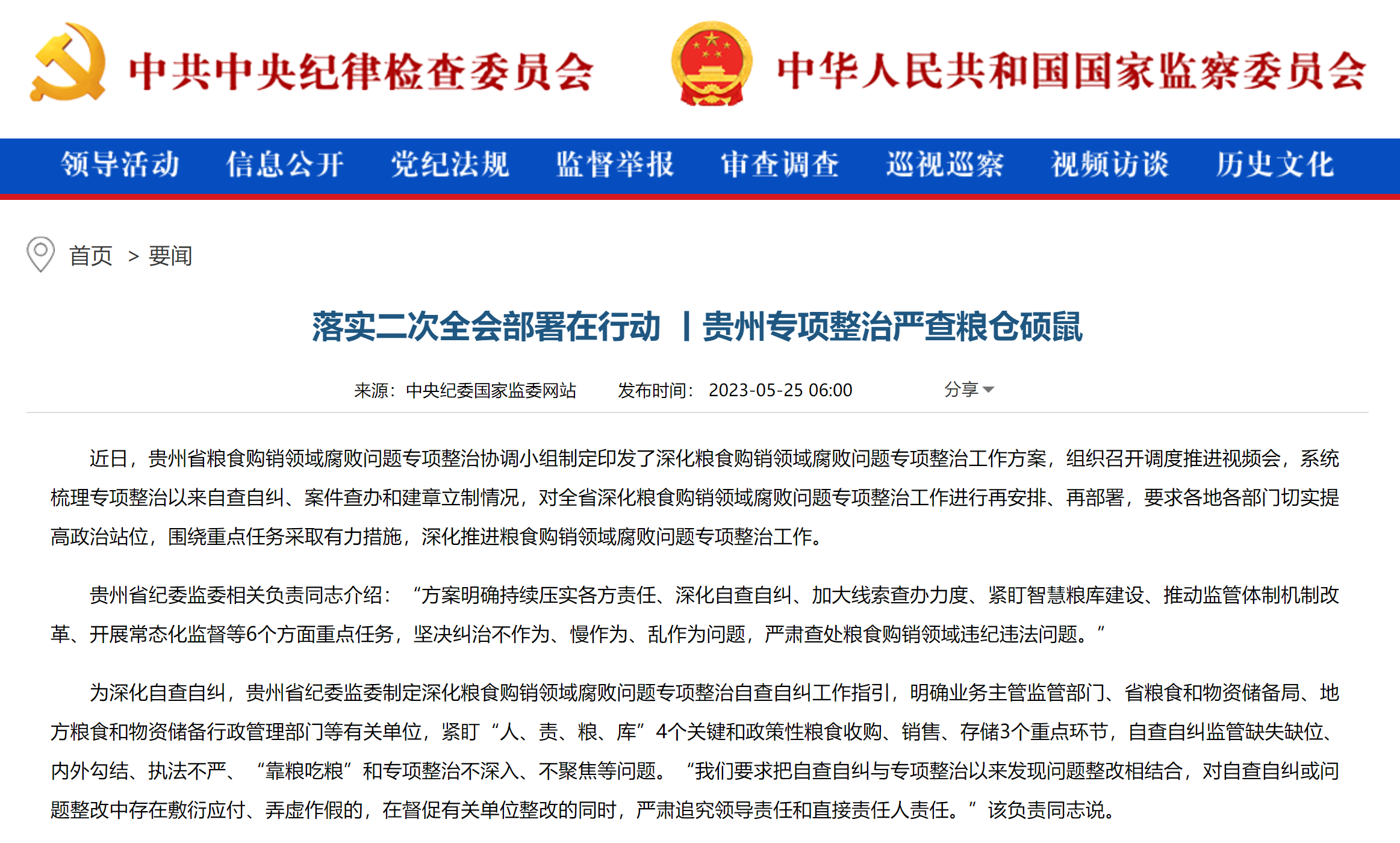 贵州省纪委监委相关负责同志介绍:“方案明确持续压实各方责任、深化自查自纠、加大线索查办力度、紧盯智慧粮库建设、推动监管体制机制改革、开展常态化监督等6个方面重点任务,坚决纠治不作为、慢作为、乱作为问题,严肃查处粮食购销领域违纪违法问题。”