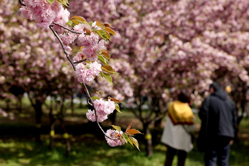 ↑4月9日,游客在石家庄市栾城区樱花公园休闲游玩。新华社记者 骆学峰 摄
