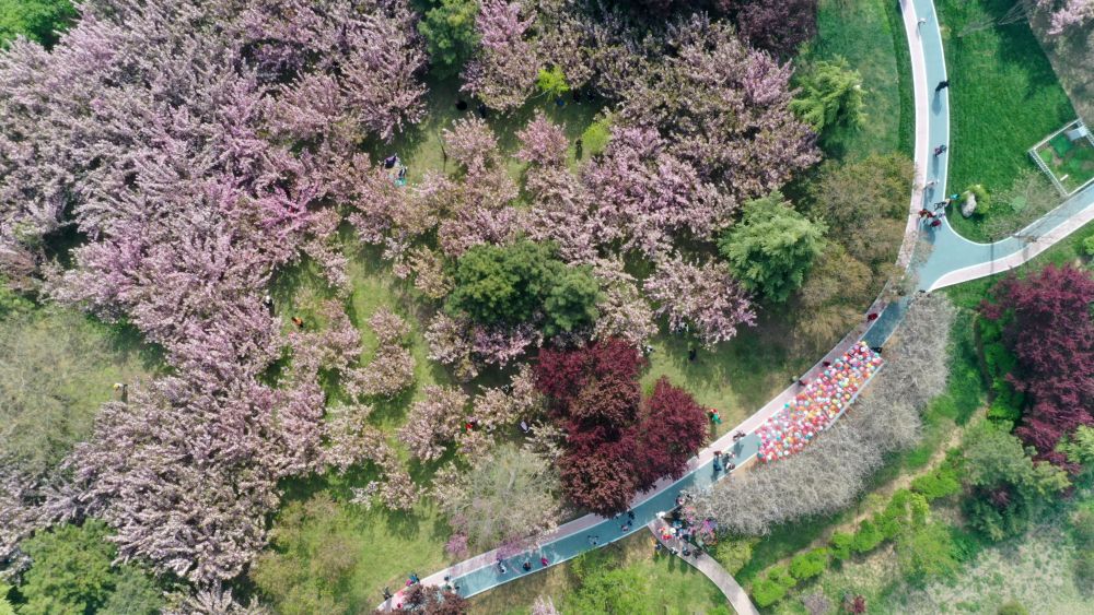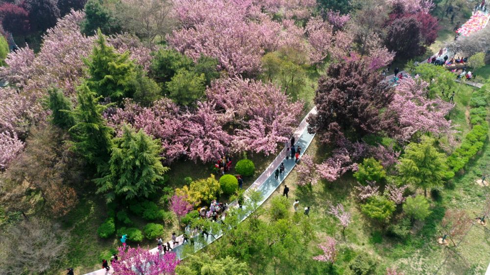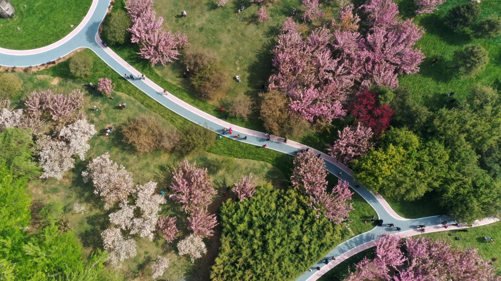 ↑4月9日,游客在石家庄市栾城区樱花公园休闲游玩(无人机照片)。新华社记者 骆学峰 摄