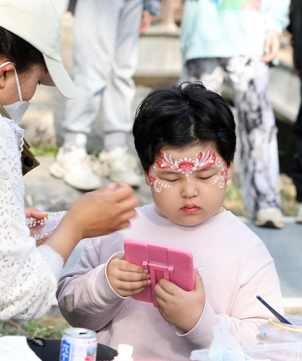 ↑4月9日,化妆师在石家庄市栾城区樱花公园的樱花节主题活动上为小朋友进行面部彩绘。新华社记者 骆学峰 摄