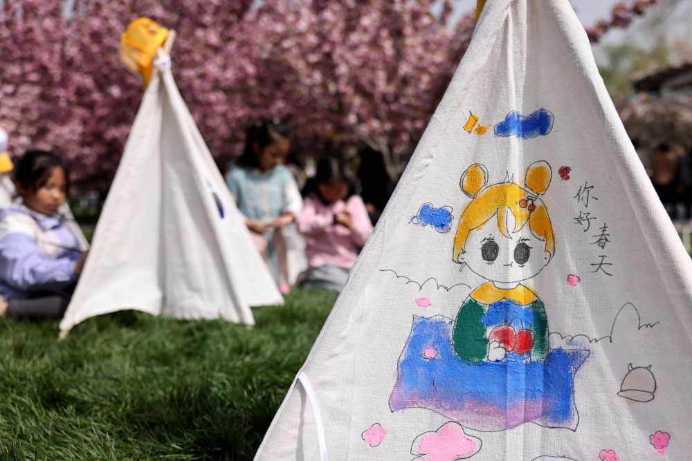 ↑4月9日,小朋友在石家庄市栾城区樱花公园的樱花节主题活动中手工绘制帐篷。新华社记者 骆学峰 摄