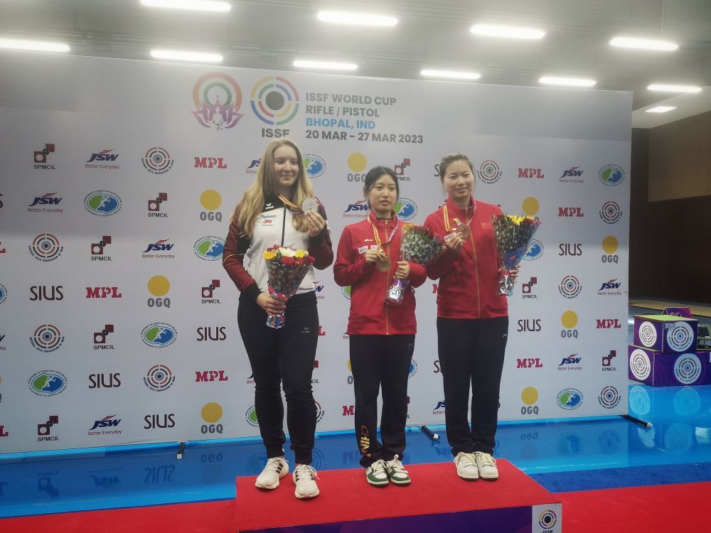 国际射击运动联合会官网消息,在22日进行的射击世界杯印度站比赛中,中国射击队李雪和钱微分获女子10米气手枪金牌和铜牌,印度选手辛格强势拿下男子10米气手枪冠军。
