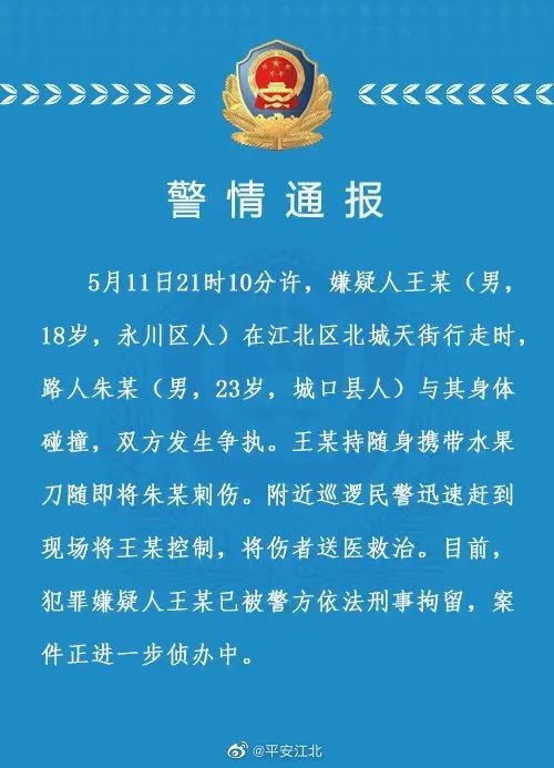 5月11日21时10分许,嫌疑人王某 (男18岁,永川区人)在江北区北城天街行走时,路人朱某(男,23岁,城口县人) 与其身体碰撞,双方发生争执。王某持随身携带水果刀随即将朱某刺伤。附近巡逻民警迅速赶到现场将王某控制,将伤者送医救治。目前,犯罪嫌疑人王某已被警方依法刑事拘留,案件正进一步侦办中。