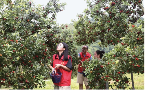 近日,贵州省黎平县中潮镇党员志愿者帮助果农采摘杨梅。连日来,黎平县党员志愿服务队深入田间地头,开展助农服务,助力乡村产业发展。