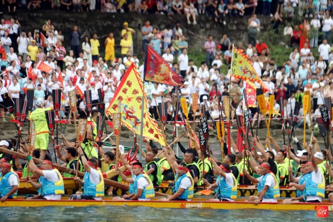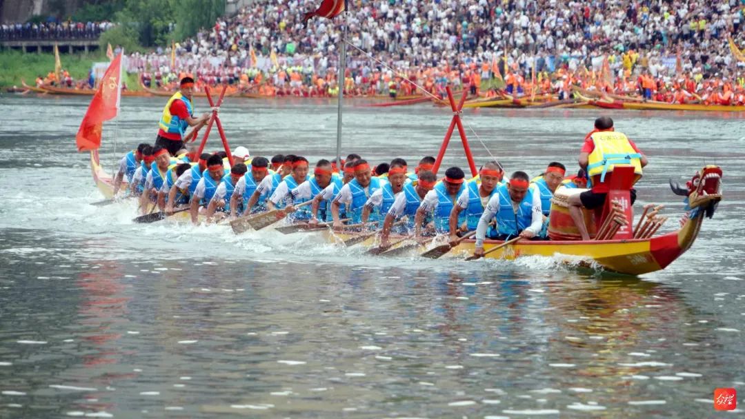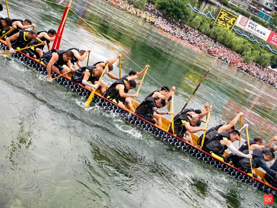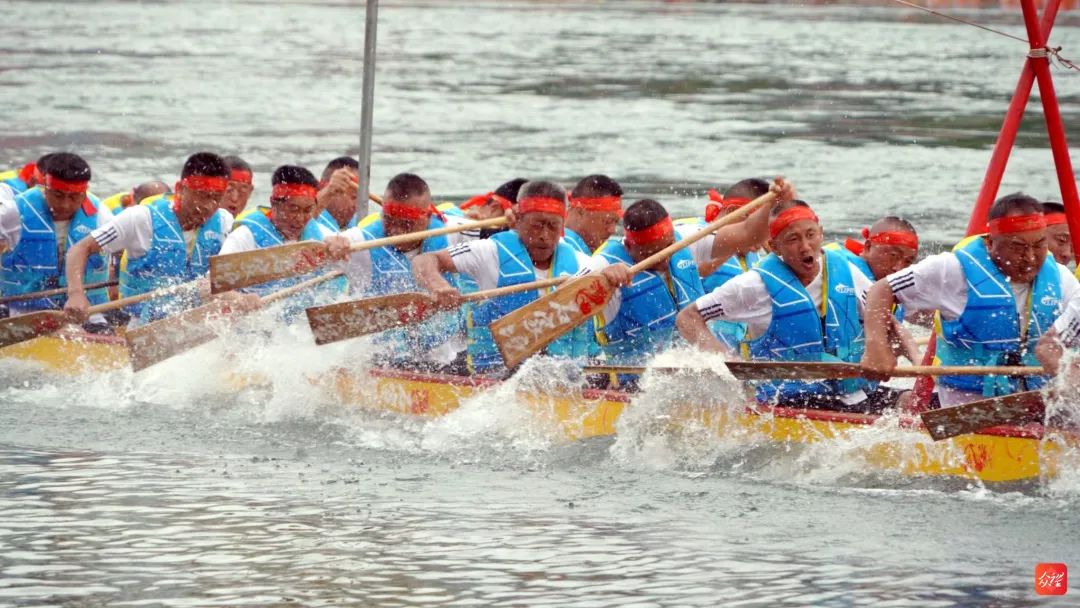 随着开赛信号发出,比赛正式开始。宽阔的河道上,伴随着“咚咚咚咚”的鼓点声,划手们手起桨落,前俯后仰,动作整齐,竞渡的龙舟如离弦之箭在水面疾驶,波涛拍岸,两岸观众不停地呐喊助威,场面蔚为壮观。