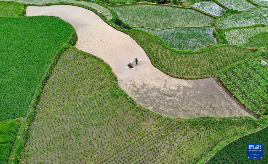 6月20日,贵州省黔东南苗族侗族自治州丹寨县金泉街道排正村村民在梯田间犁田(无人机照片)。 新华社发(黄晓海 摄)