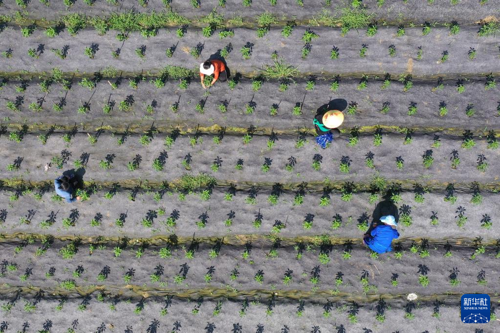 6月20日,村民在贵州省黔东南苗族侗族自治州岑巩县注溪镇注溪村辣椒种植基地劳作(无人机照片)。新华社发(唐鹏 摄)
