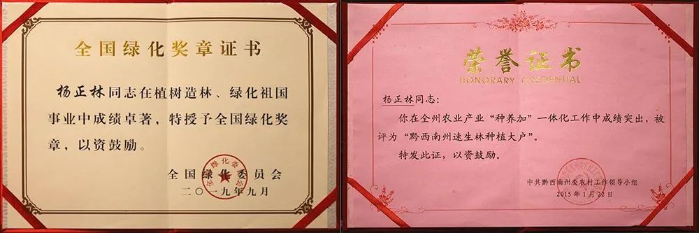 2016年,杨正林和儿子、女婿商议决定,将自已种植的部分成材林抵押,贷款160万元,流转城南街道保驹村老八寨组和上坝组2000余亩荒山继续造林。两年时间,十几个山头种上了60多万棵杉树苗。杨正林的造林成效也得到各级政府的好评,并给予大力支持,荣获全国绿化奖章、黔西南十佳造林大户奖章、黔西南州速生林种植大户奖章、黔西南州“文朝荣”个人奖林业种植能手等荣誉。