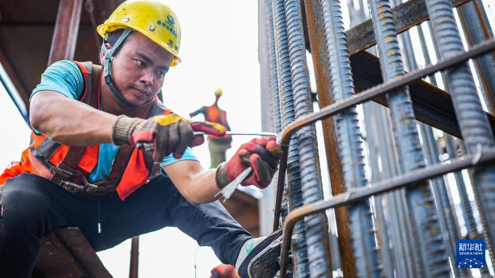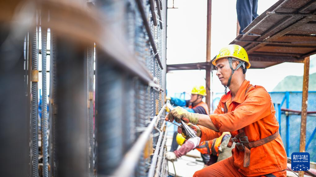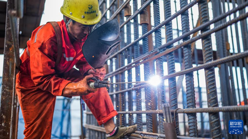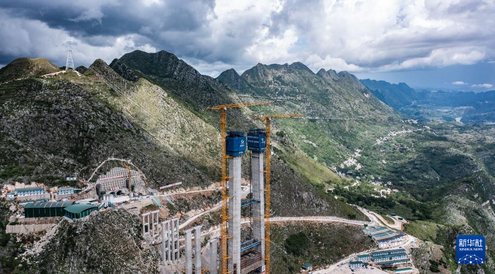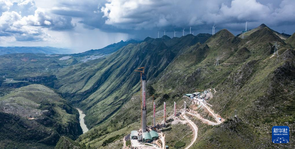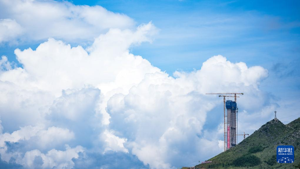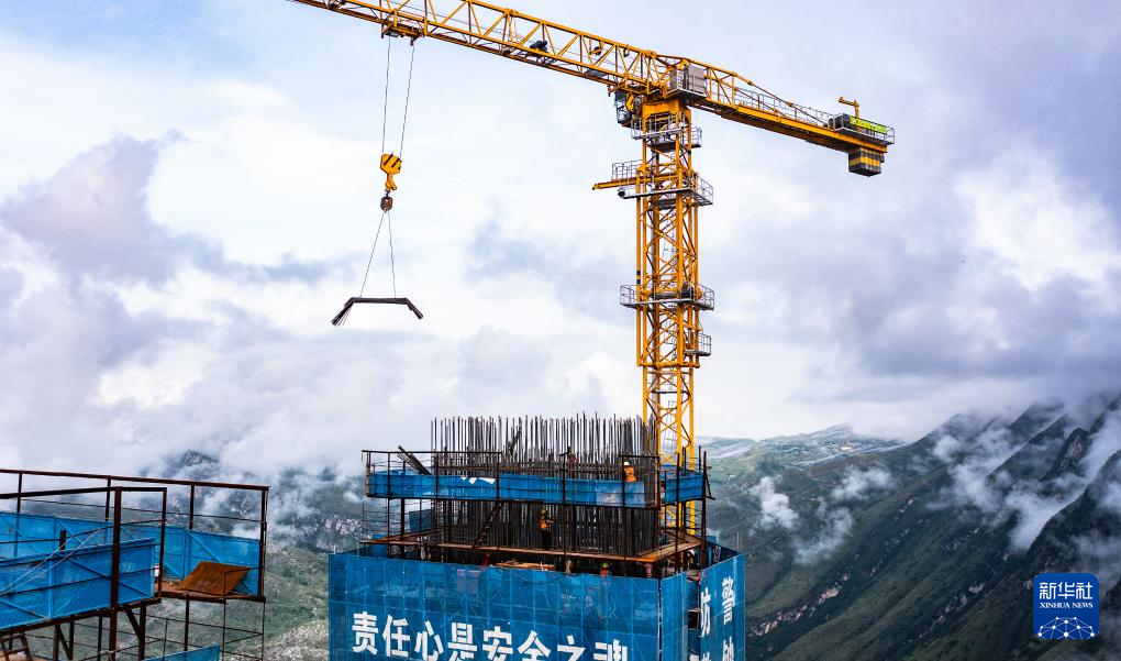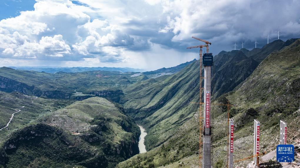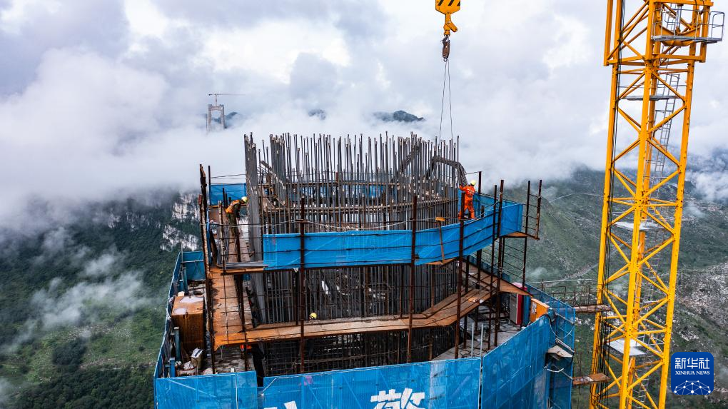 正在修建中的花江峡谷大桥5号主塔(8月3日摄)。新华社记者 陶亮 摄