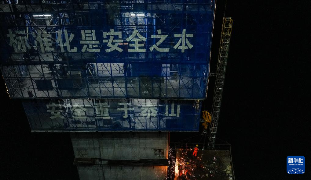 贵州公路集团工人在花江峡谷大桥5号主塔进行夜间施工(8月2日摄)。新华社记者 陶亮 摄