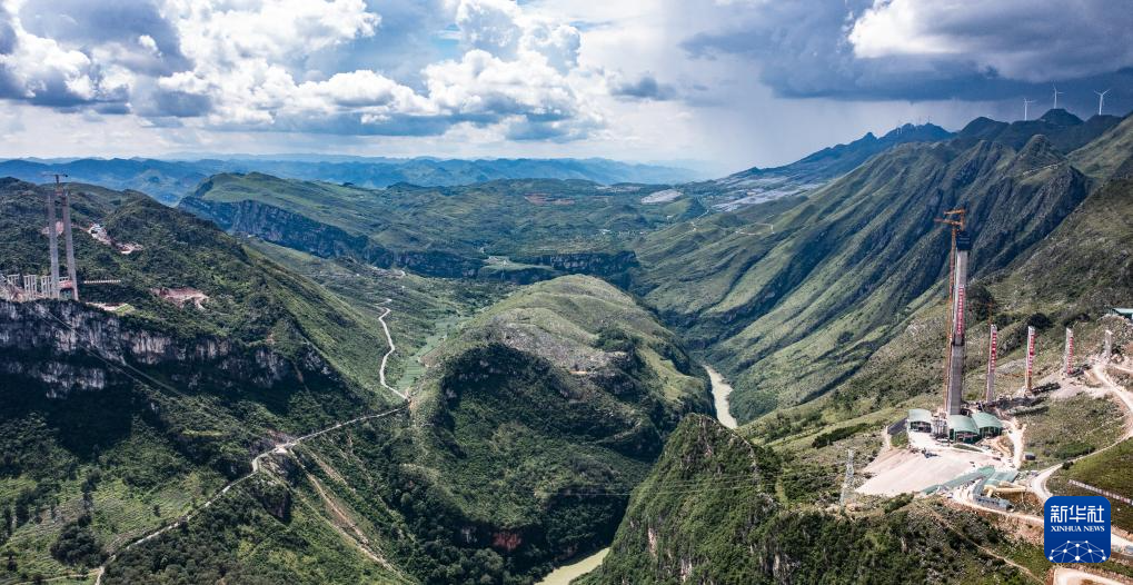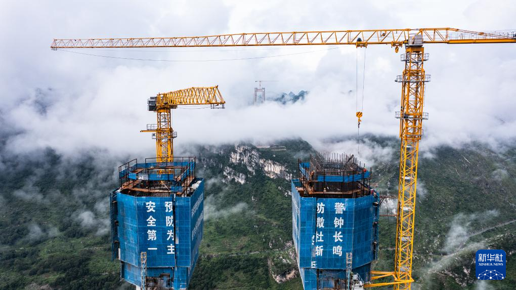 正在修建中的花江峡谷大桥5号主塔(右)(8月2日摄,无人机照片)。新华社记者 陶亮 摄