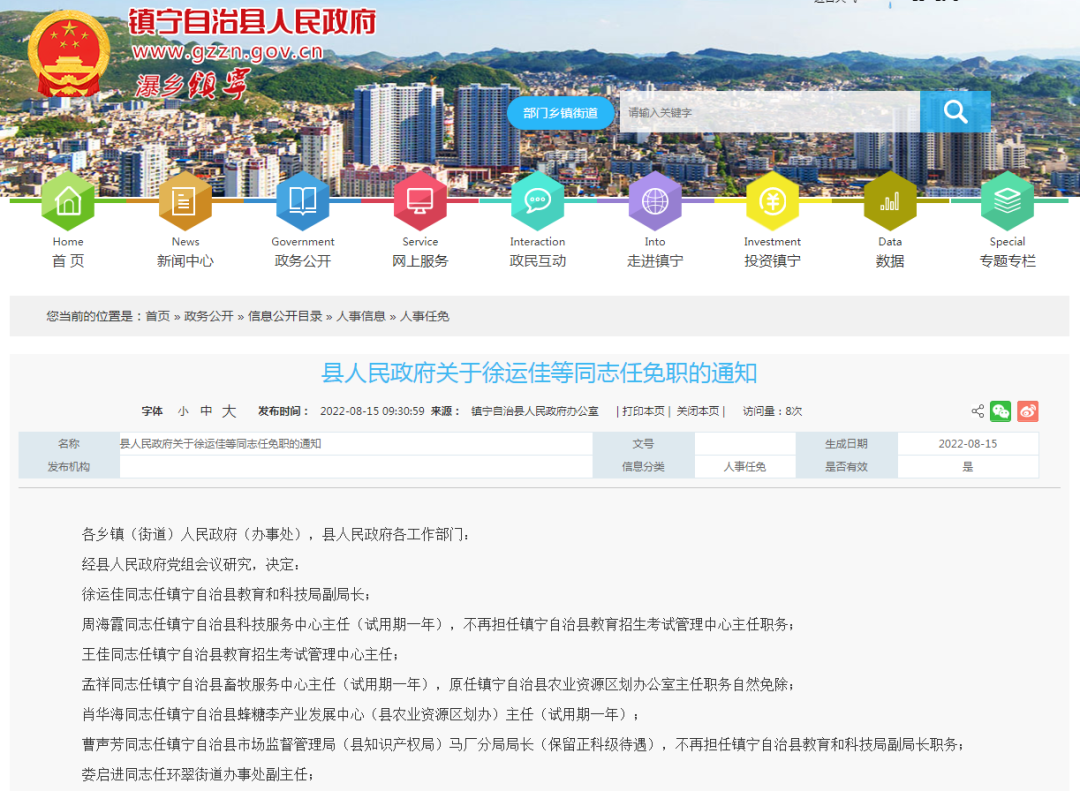 徐运佳同志任镇宁自治县教育和科技局副局长;