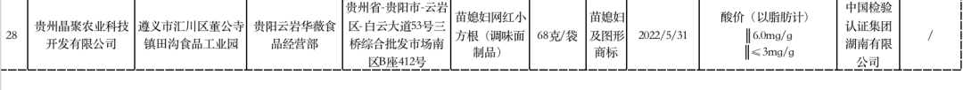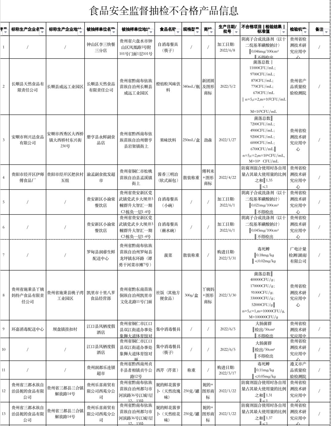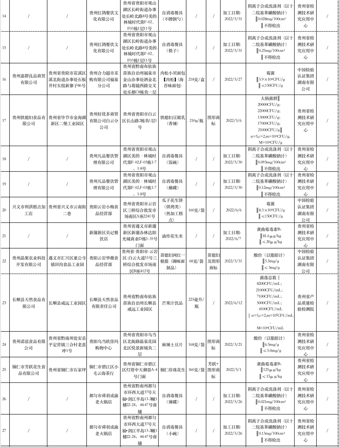日前,贵州省市场监管局发布关于28批次食品抽检不合格情况的通告称,近期抽取24大类食品1815批次样品,检出餐饮食品、炒货食品及坚果制品、豆制品、方便食品、糕点、食用农产品、蔬菜制品、薯类和膨化食品、饮料9大类食品中28批次样品不合格。不合格项目涉及菌落总数、大肠菌群、霉菌、黄曲霉毒素B1、毒死蜱、防腐剂混合使用时各自用量占其最大使用量的比例之和、阴离子合成洗涤剂(以十二烷基苯磺酸钠计)、酸价(以脂肪计)指标。