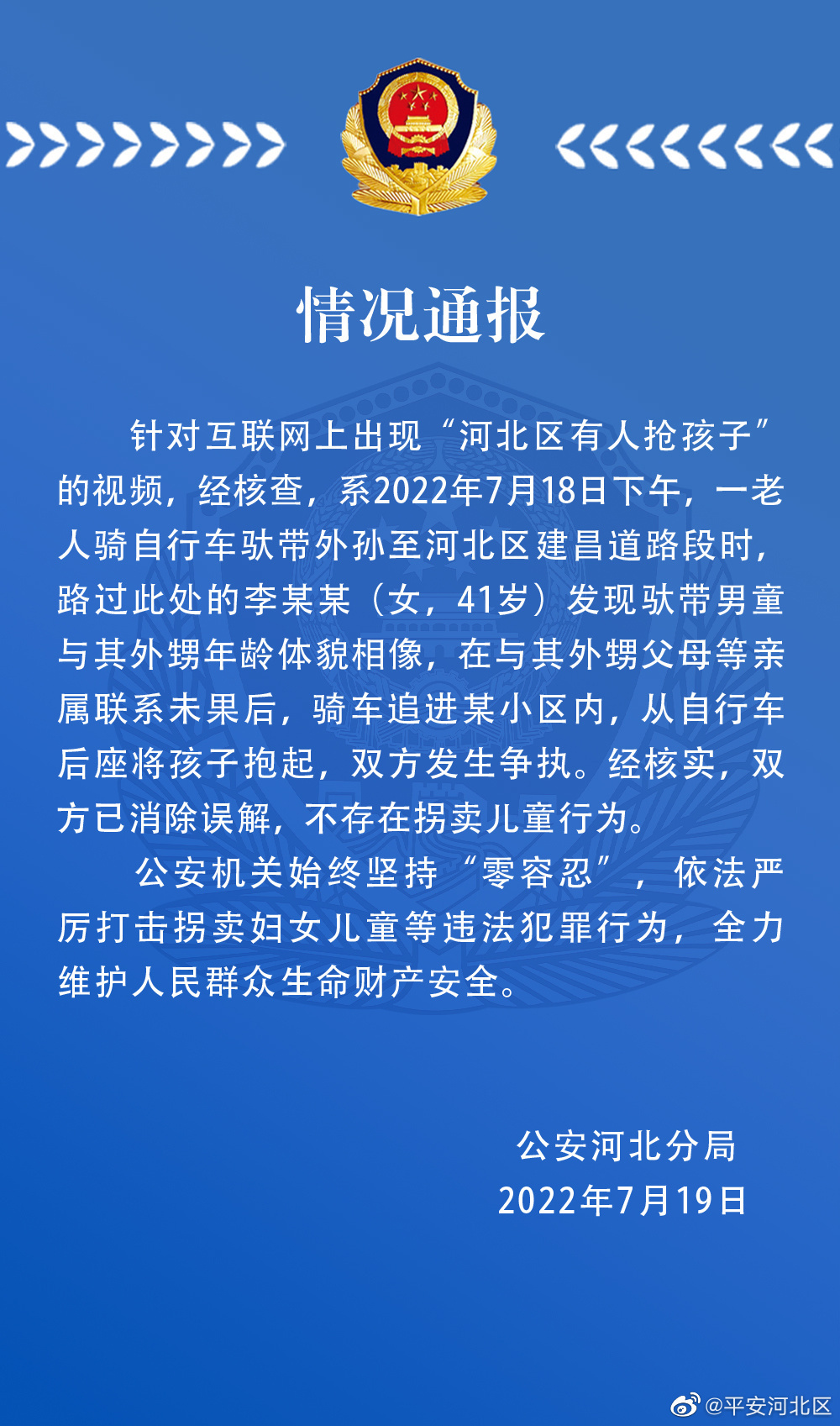 天津市公安局河北分局官方微博7月19日发布情况通报称,针对互联网上出现“ 河北区有人抢孩子”的视频,经核查,系2022年7月18日下午,一老人骑自行车驮带外孙至河北区建昌道路段时,路过此处的李某某(女,41岁)发现驮带男童与其外甥年龄体貌相像,在与其外甥父母等亲属联系未果后,骑车追进某小区内,从自行车后座将孩子抱起,双方发生争执。经核实,双方已消除误解,不存在拐卖儿童行为。