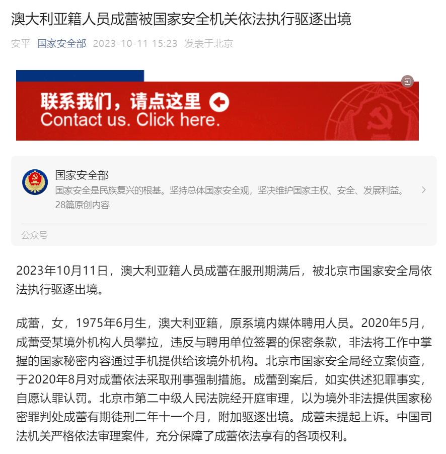 2023年10月11日,澳大利亚籍人员成蕾在服刑期满后,被北京市国家安全局依法执行驱逐出境。