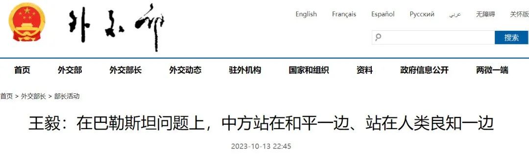 王毅强调,在巴勒斯坦问题上,中方将继续站在和平一边,站在公道一边,站在国际法一边,站在大多数国家的共同愿望一边,站在人类良知一边。