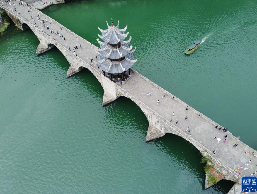 10月4日,游客在贵州省黔东南苗族侗族自治州镇远县古城游玩(无人机照片)。新华社发(邰胜智 摄)