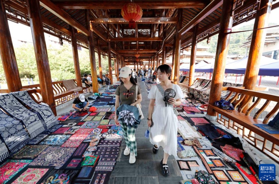 10月4日,游客在贵州省黔东南苗族侗族自治州凯里市民族风情园非遗集市参观。新华社发(杨晓海 摄)