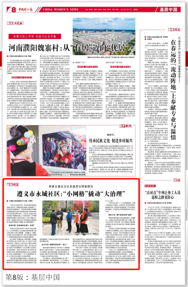 “我们把党支部建在网格上,就是要让党组织和党员在基层治理中发挥战斗堡垒和先锋模范作用,把党的政治优势、组织优势转化为基层治理效能。”永城社区党委书记告诉中国妇女报全媒体记者。