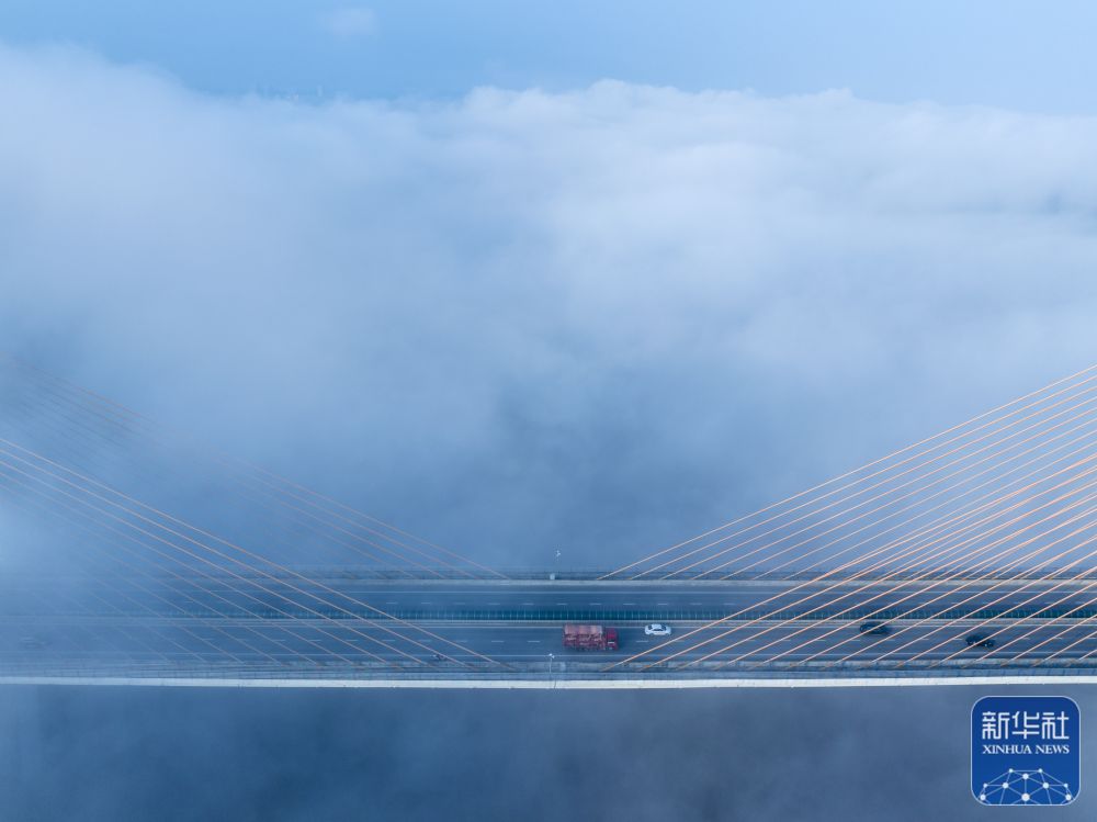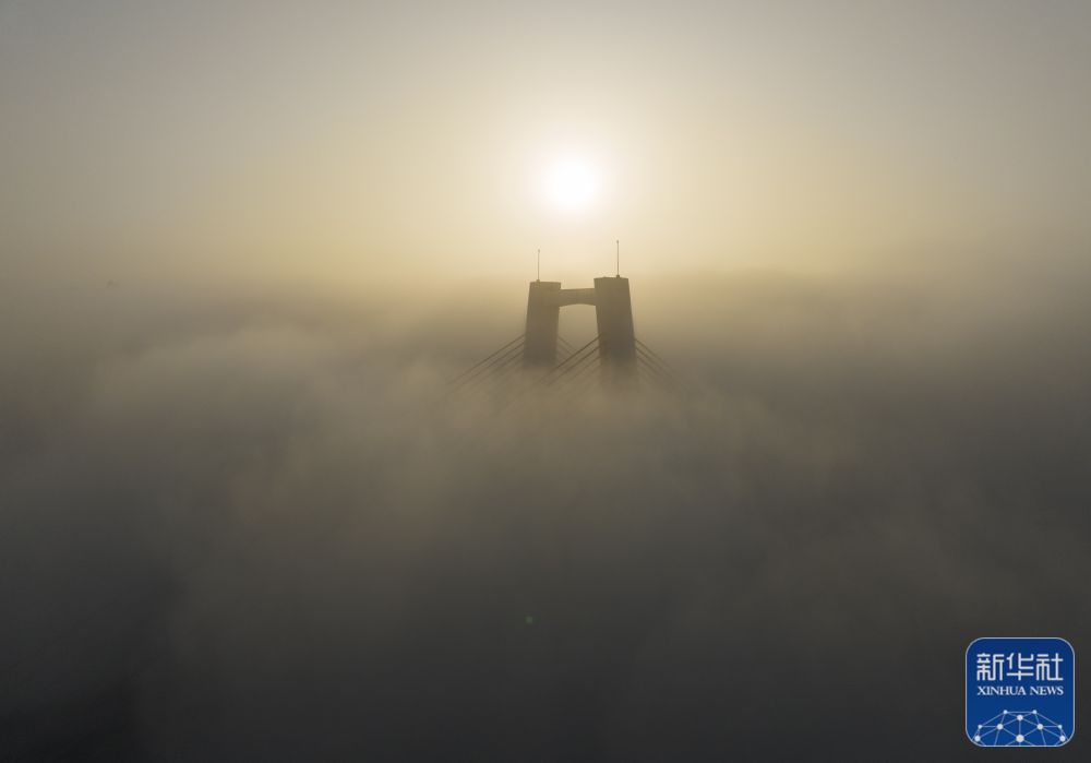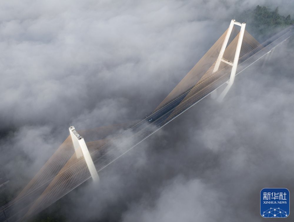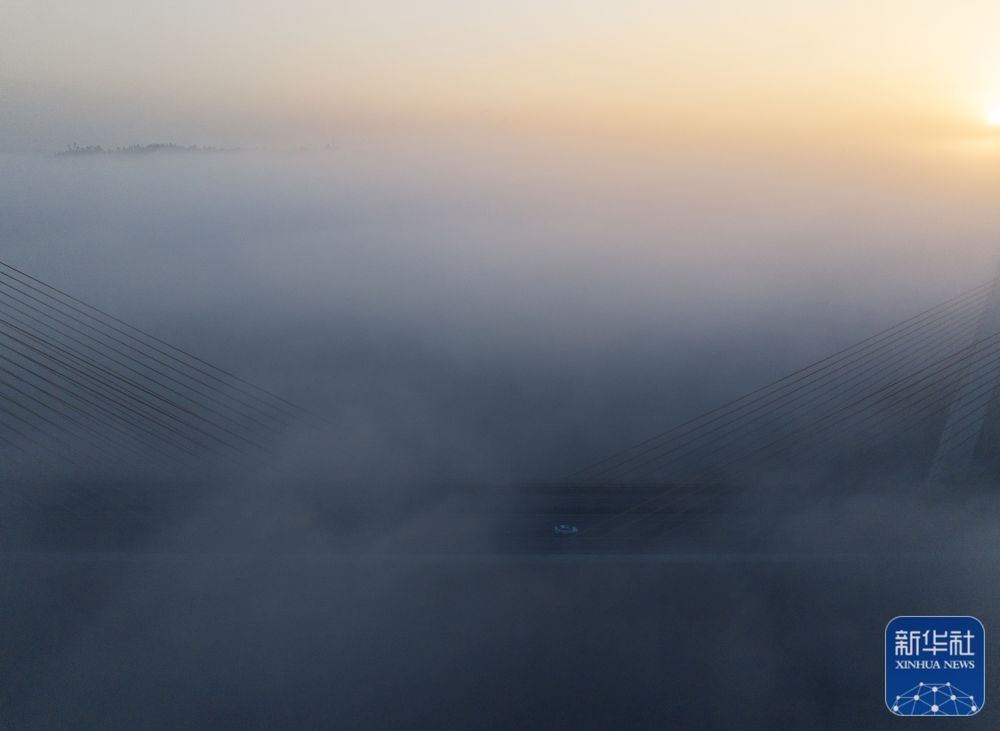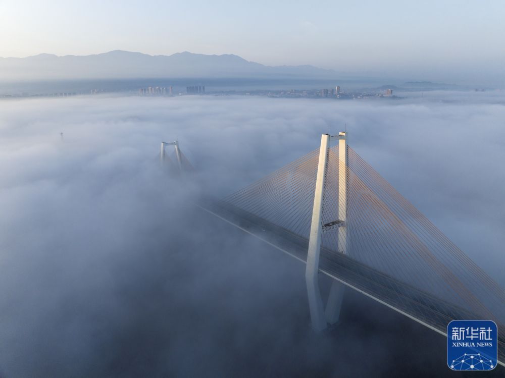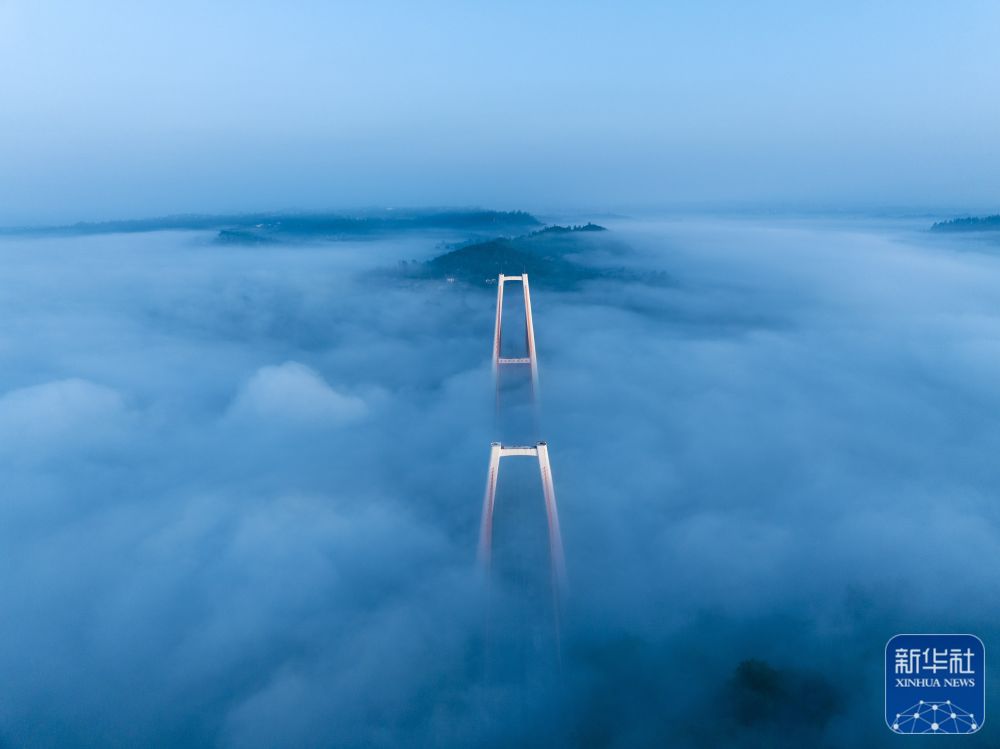 7月22日清晨,四川省广安市清溪口渠江大桥云雾缭绕,在朝阳映照下美若仙境。