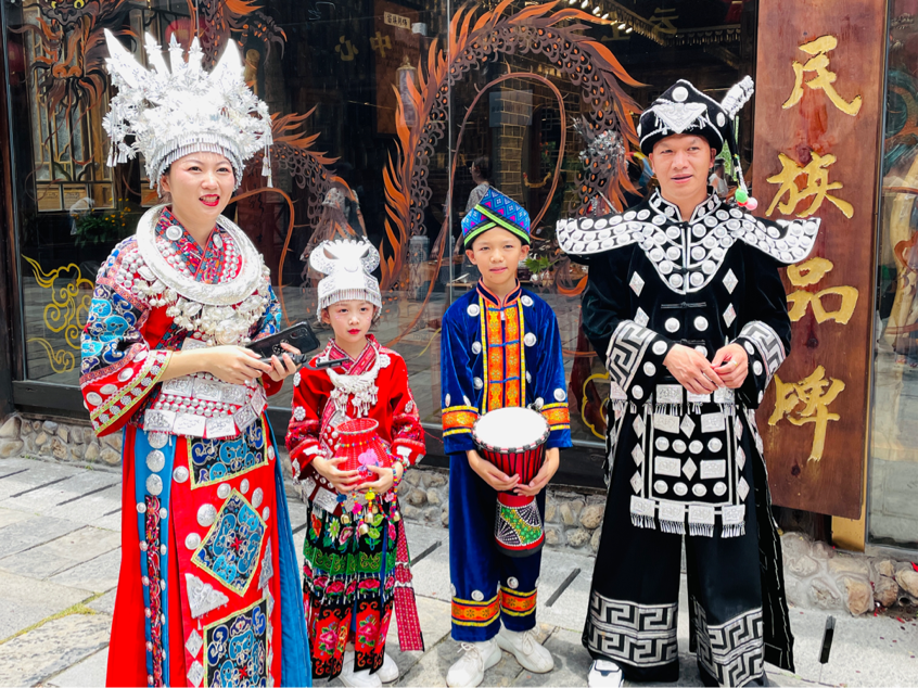 来自广东茂名的李女士一家四口来到丹寨县,穿着苗族服饰,行走在丹寨万达小镇的街道上。他们认为丹寨的风景美丽,民风淳朴,热情好客,民族服饰吸引了他们,这里的游玩体验非常好。并且趁假期带孩子来参加这样的活动,初衷就是想带孩子感受非遗的魅力,增长见识,打开眼界,来参加丹寨非遗周的活动,比任何夏令营都有意义。