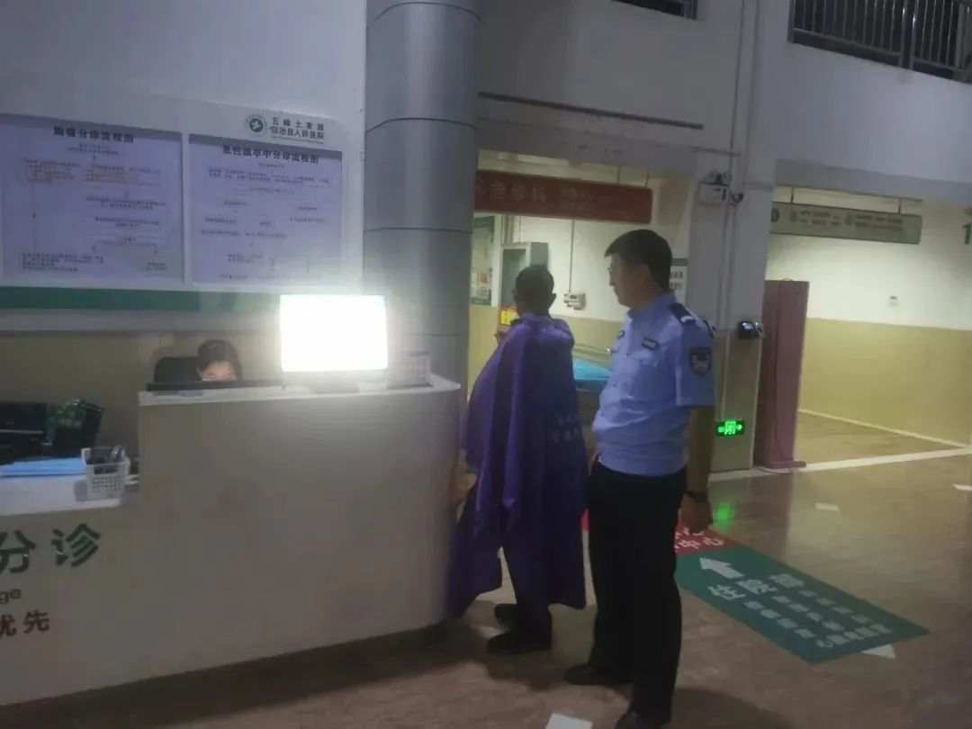 一身披蓝色雨衣的老人淋着雨站在旁边