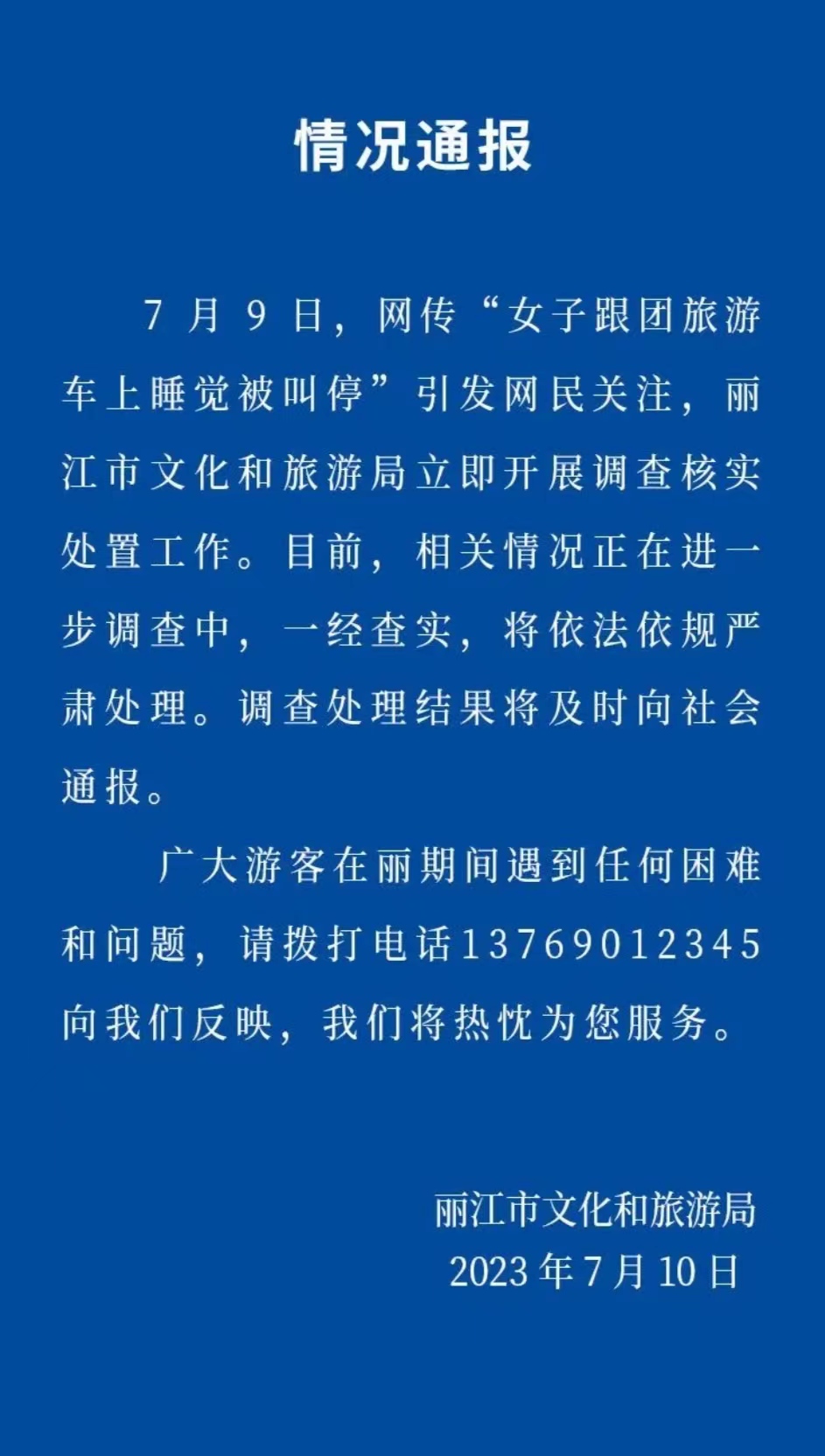 7月11日,丽江市文化和旅游局发布关于“女子跟团旅游车上睡觉被叫停” 的调查处理情况通报: