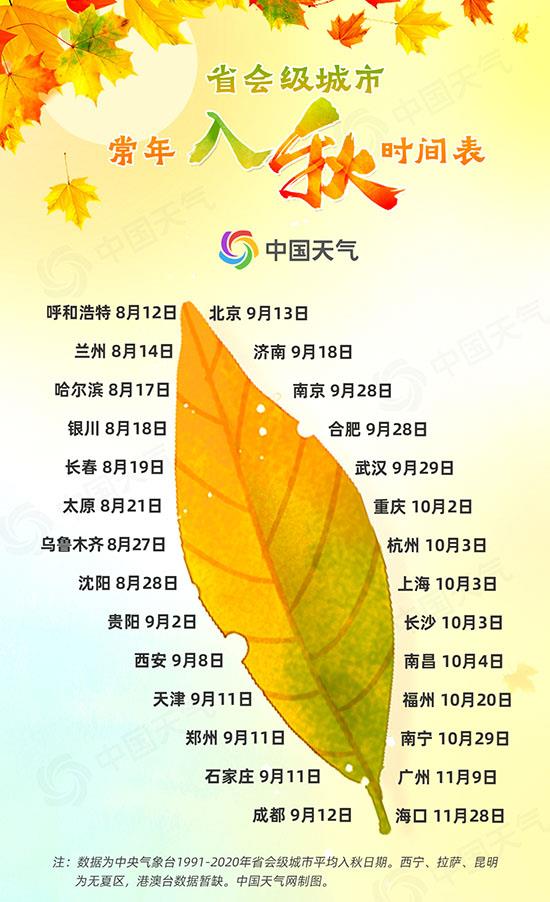 常年省会级城市入秋时间表出炉