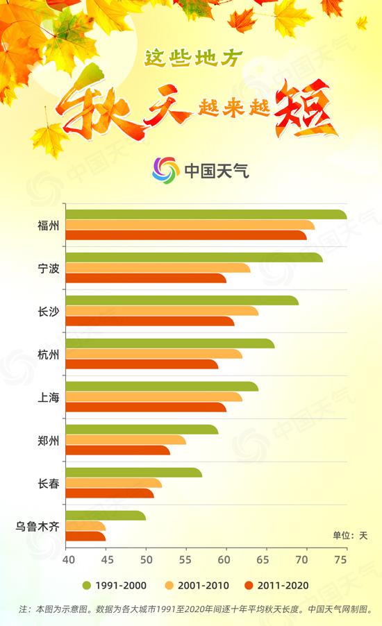 秋天不仅来得晚了,长度也在逐步缩短。大城市中,长沙、宁波、杭州、上海、郑州、银川等地秋季明显“缩水”,幅度较大的宁波,从20世纪90年代至今,秋季缩短12天,银川、杭州、长沙也变少了7天至9天。