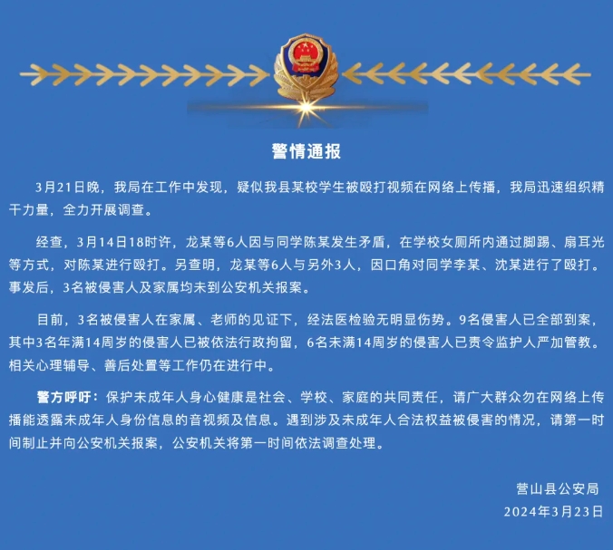 3月21日晚,我局在工作中发现,疑似我县某校学生被殴打视频在网络上传播,我局迅速组织精干力量,全力开展调查。
