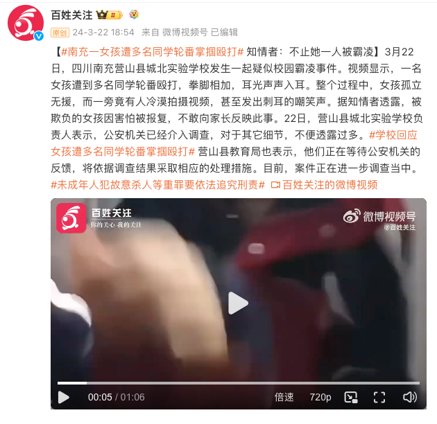 近日,四川南充营山县城北实验学校发生一起疑似校园霸凌事件。视频显示,一名女孩遭到多名同学轮番殴打。