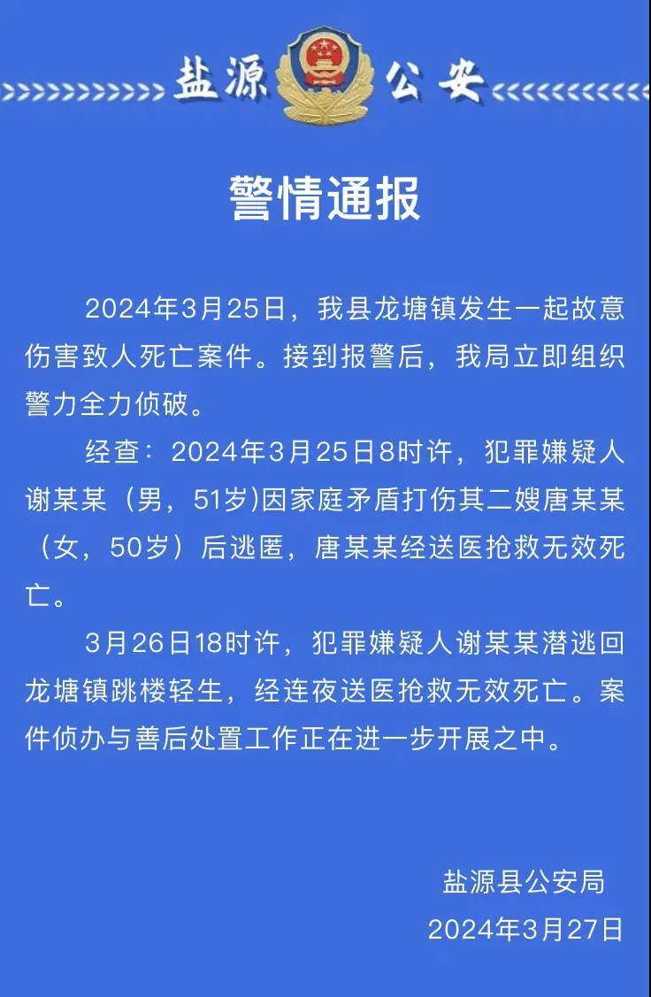 3月26日18时许,犯罪嫌疑人谢某某潜逃回龙塘镇跳楼轻生,经连夜送医抢救无效死亡。案件侦办与善后处置工作正在进一步开展之中。