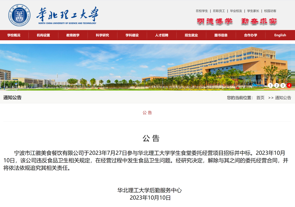 宁波市江徽美食餐饮有限公司于2023年7月27日参与华北理工大学学生食堂委托经营项目招标并中标。2023年10月10日,该公司违反食品卫生相关规定,在经营过程中发生食品卫生问题。经研究决定,解除与其之间的委托经营合同,并将依法依规追究其相关责任。
