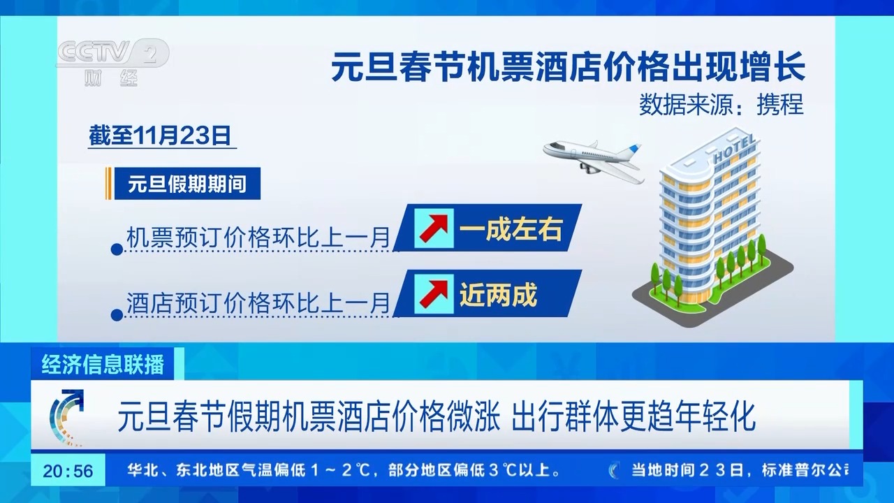 数据显示:截至11月23日,元旦假期期间,机票预订价格比上一月增长了一成左右,酒店预订价格比上一月增长了近两成。春节假期期间,酒店价格比前一月增长了近三成。