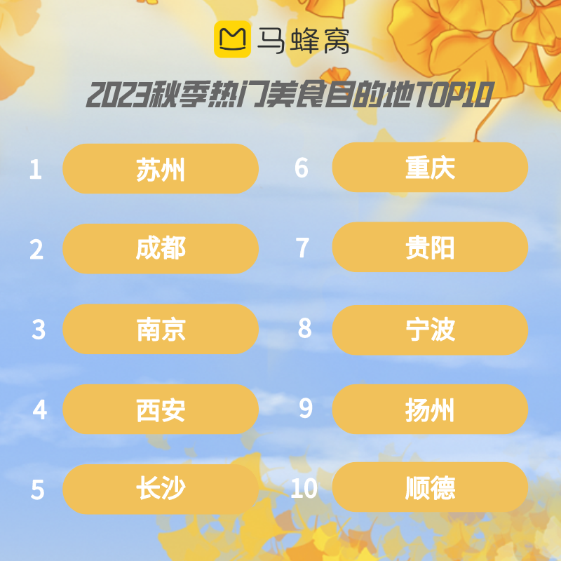 在马蜂窝玩家眼中,秋季旅行还可以是一场“色香味俱全”的享受。除了枫叶的红、银杏的黄,弥漫在空气中的清甜桂花香,错过就要等一年的时令美食也是他们竞相追逐的目标。近一周,马蜂窝各地“美食”热度平均涨幅达到75%。肠旺面、酸汤鱼、牛肉粉等令人欲罢不能的美食,将贵阳送上秋季热门美食目的地TOP10。