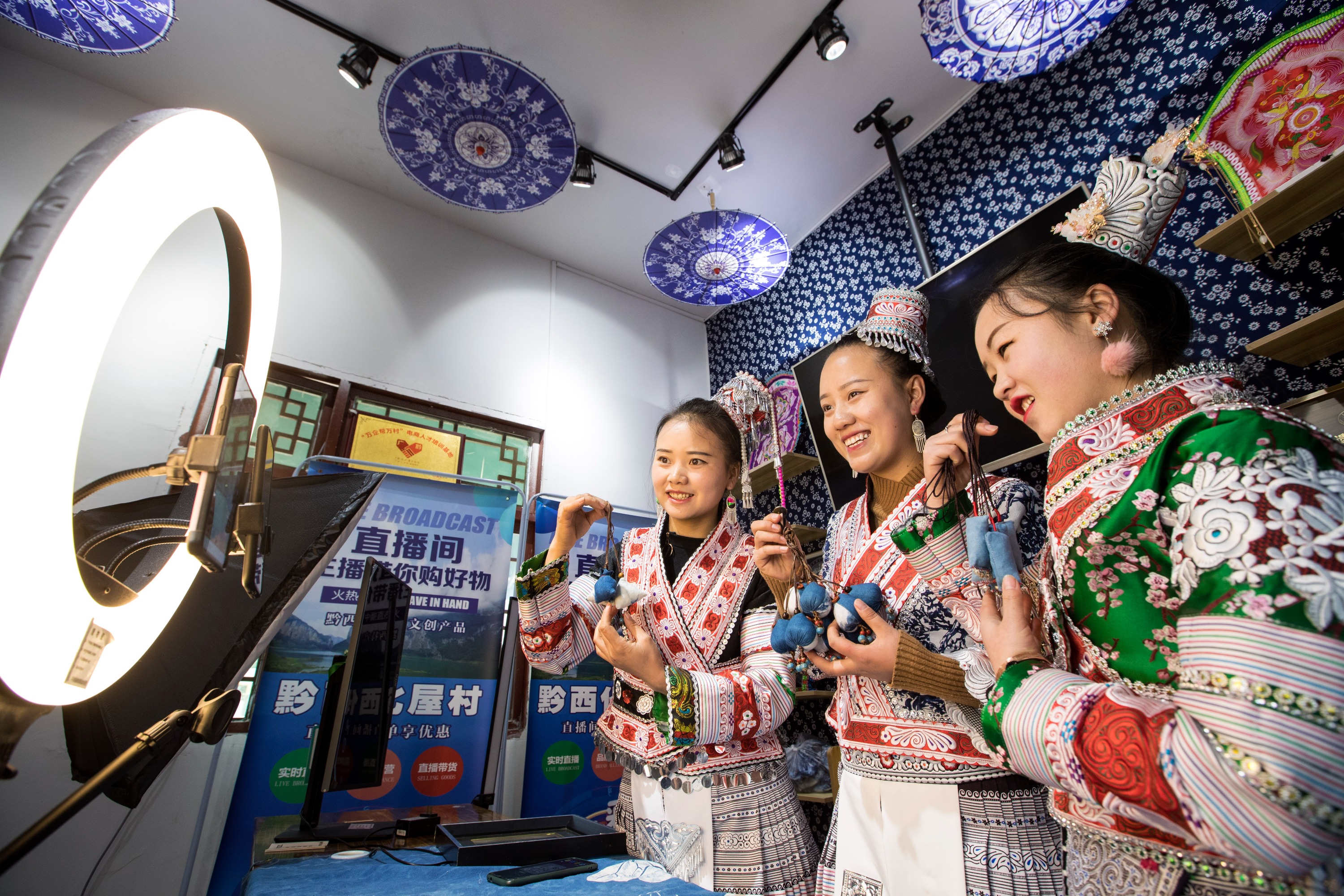 新仁苗族乡化屋村易地扶贫搬迁安置点就业车间,村民直播苗绣蜡染产品。史开心摄