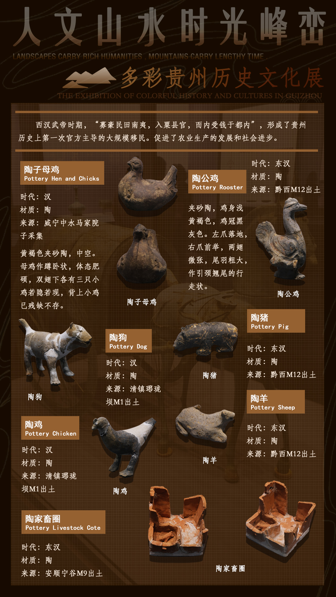 在贵州汉代古墓中,出土过不少的陶器。其中,造型独特、形象生动的陶猪、陶狗、陶鸡等不禁向我们展现出一副人们在鸡鸣狗吠中享受着田园生活的鲜活场景。古人讲究“事死如事生”,这些文物的出土正是这种观念的极致体现。