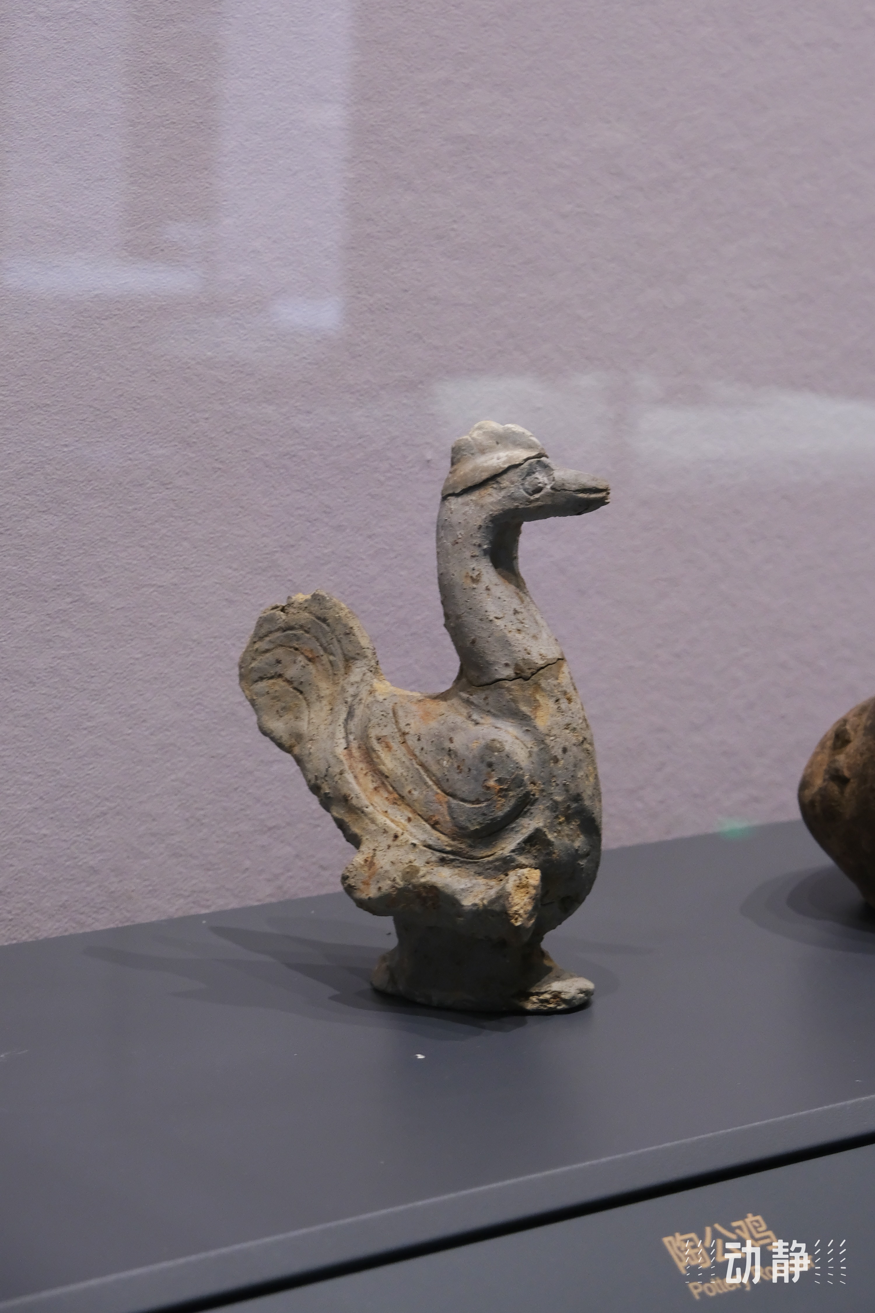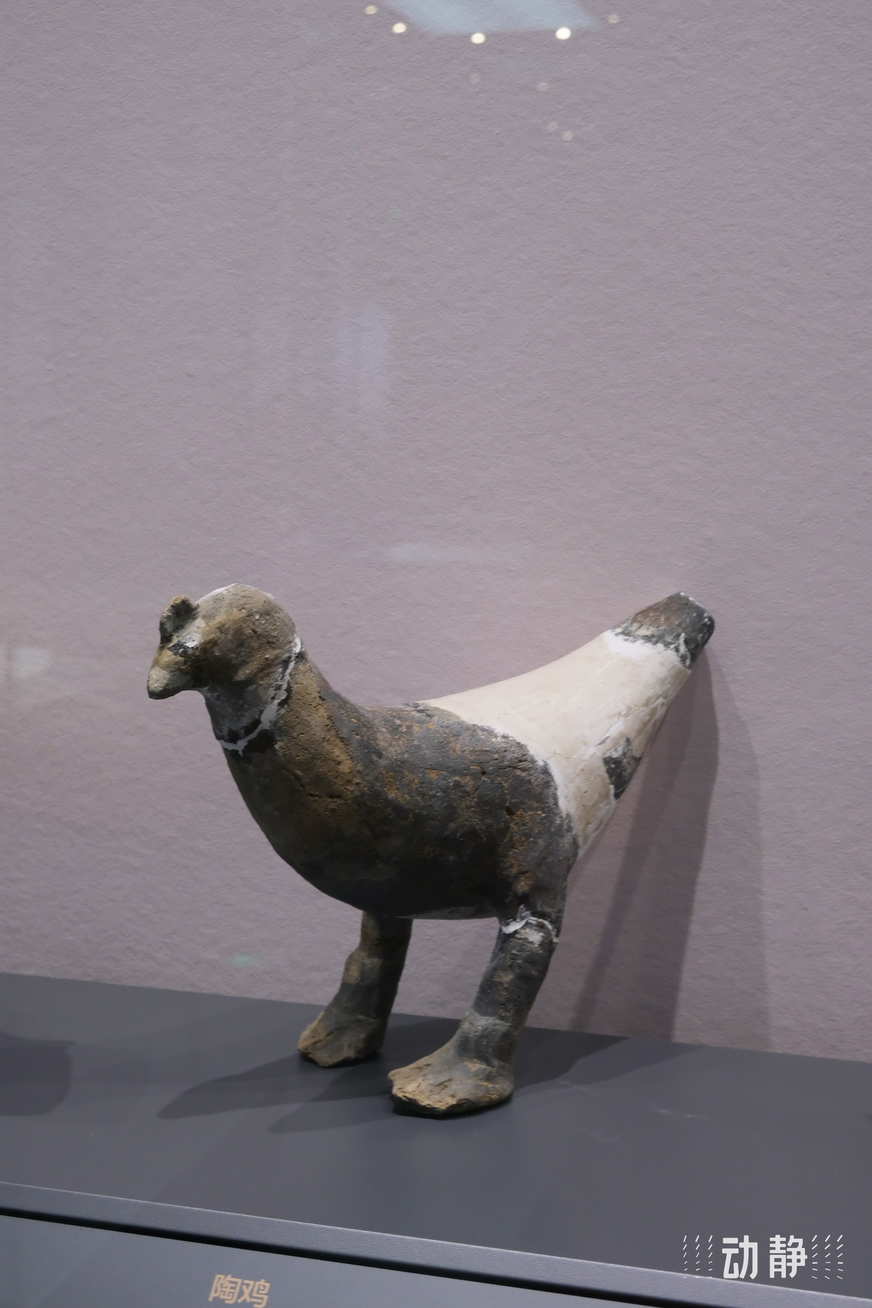 图为陶公鸡,夹砂陶,鸡身呈浅黄褐色,鸡冠黑灰色。左爪落地,右爪前举,两翅微张,尾羽粗大,作引颈翘尾的行走状。