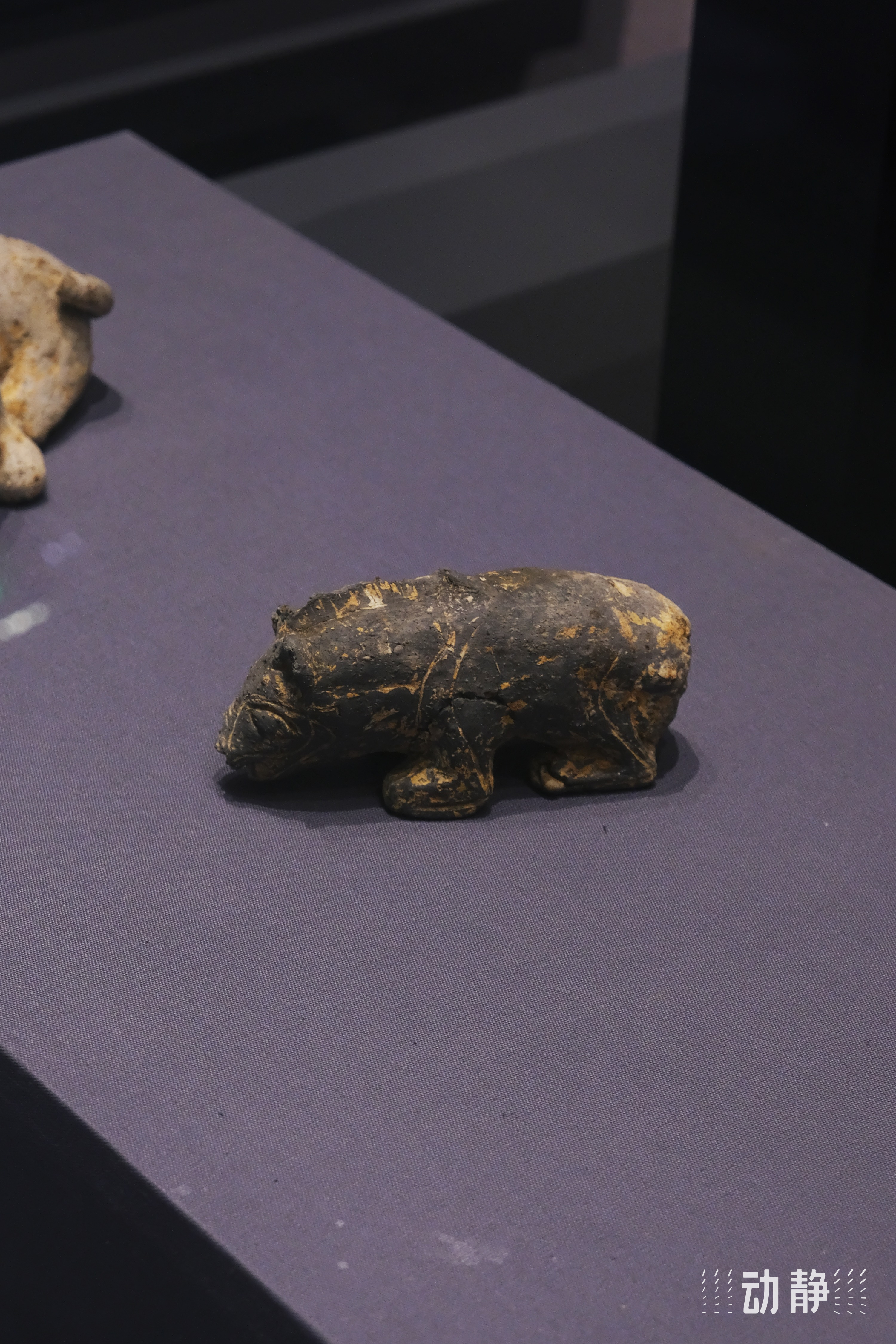 中国古代先民在新石器时期就学会了饲养猪的方法,猪在人们生活中起着重要作用。图中的陶猪1972年出土于黔西罗布夸墓葬,高5.1厘米,长11厘米,为东汉遗物。手工捏塑,低首,吻部前突较长,大嘴微张,作行走觅食状,体形比例较准,四肢粗壮,身体肥硕。背部鬃毛竖立成一棱,造型逼真,线条简洁明快。此陶猪虽造型较为简单,但却具有猪的特征,稚朴古拙,为贵州省汉代陶塑的上乘作品。