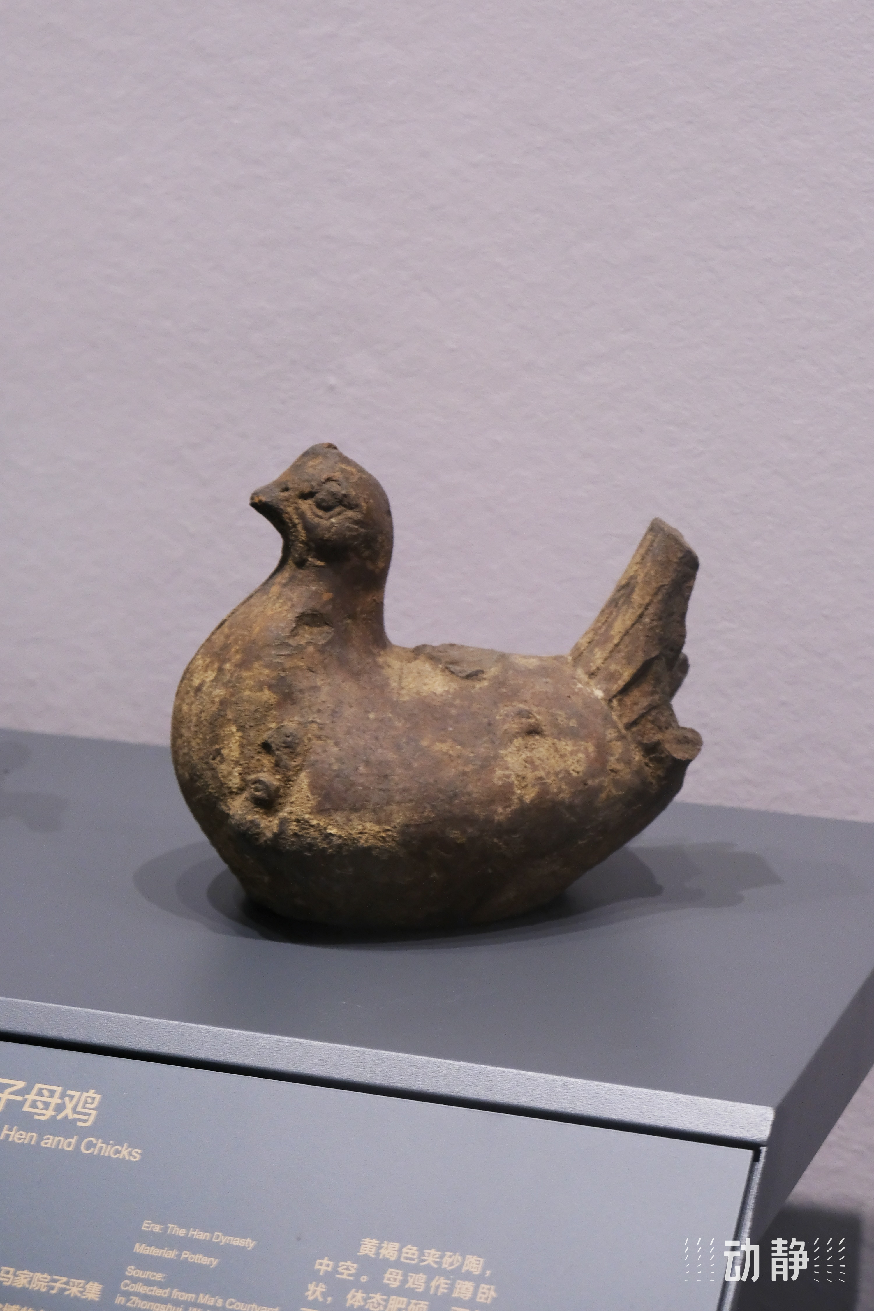 图中的陶子母鸡,为黄褐色夹砂陶,中空。母鸡作蹲卧状,体态肥硕,双翅下各有三只小鸡若隐若现,但背上小鸡已残缺不存。