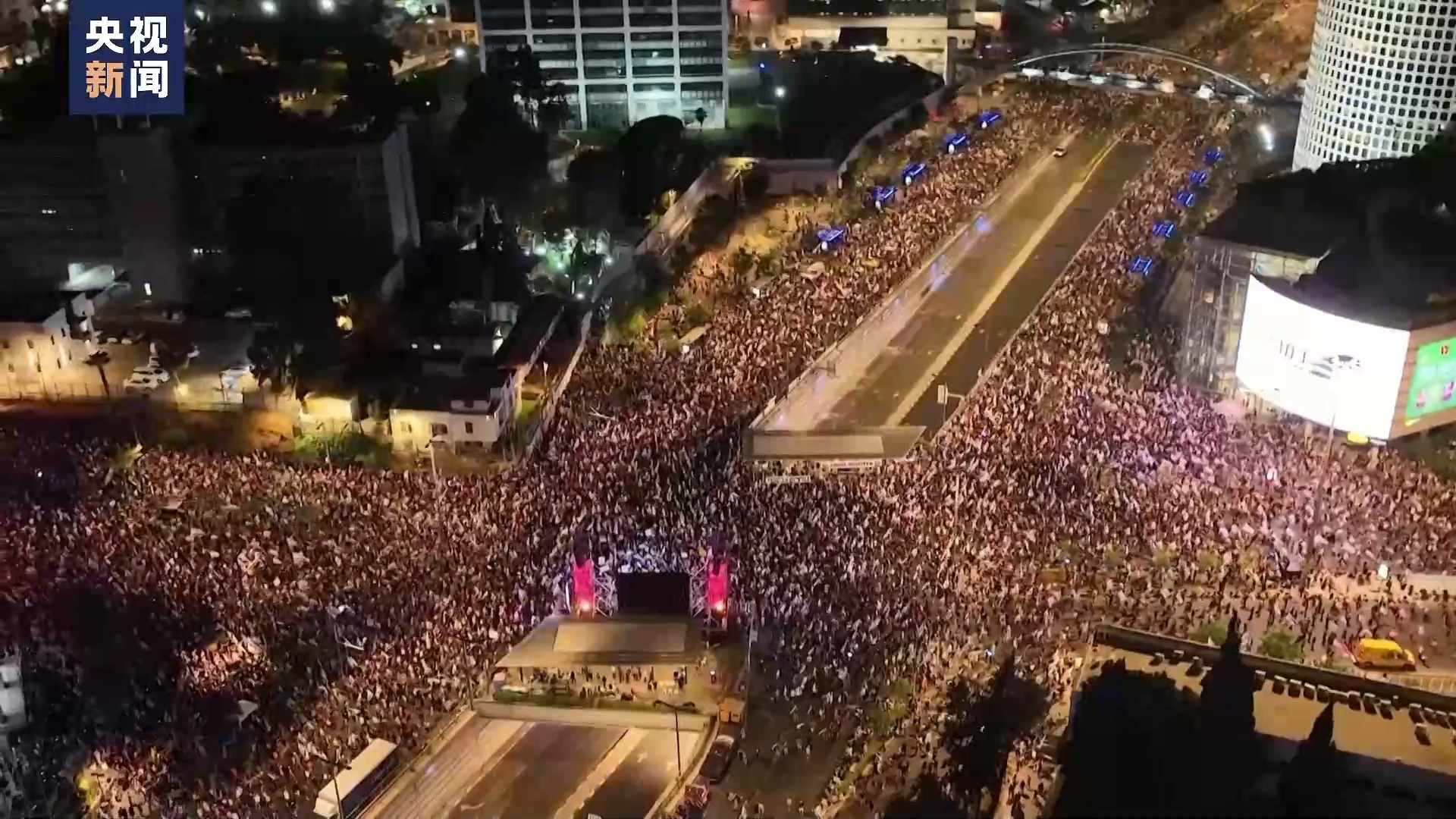 当地时间15日,在以色列特拉维夫,大批民众举行抗议集会。抗议者们呼吁尽快达成被扣押人员交换协议、结束冲突。