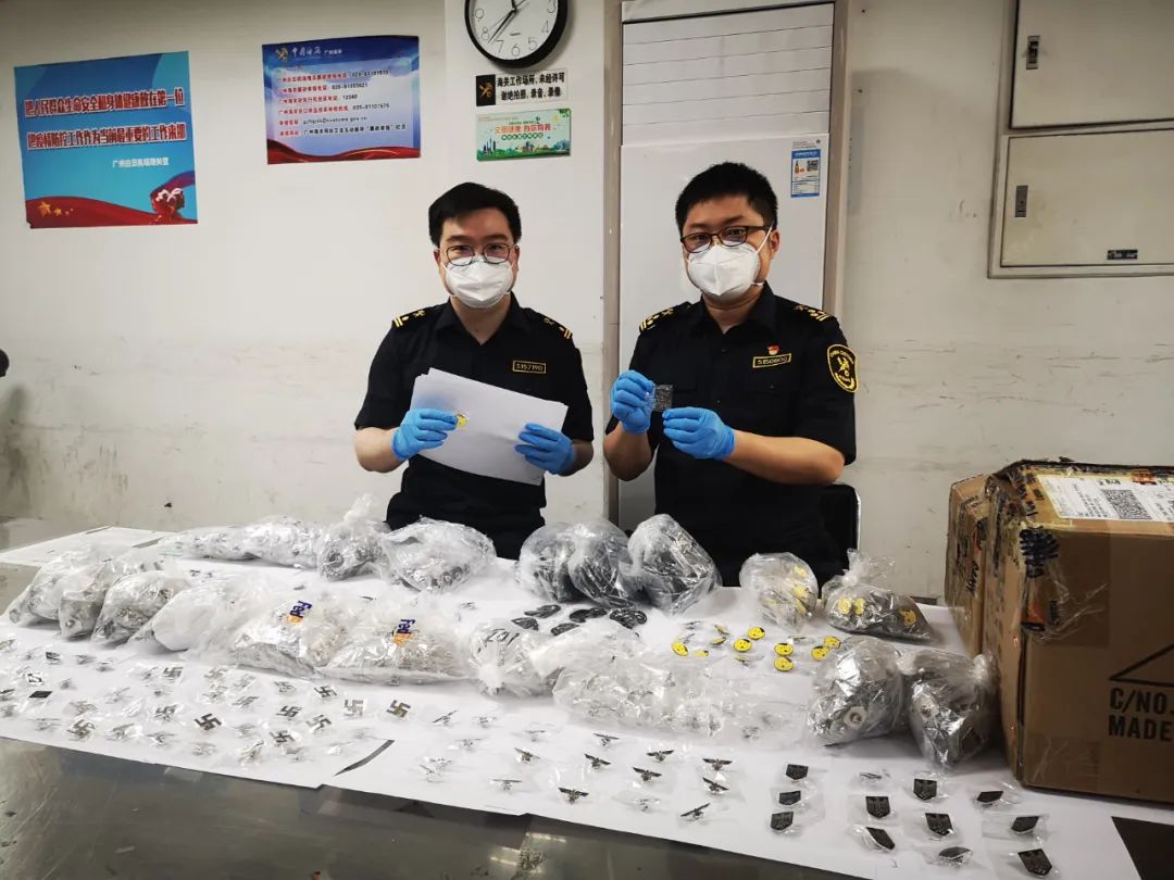记者5月12日从广州海关获悉,该关近日在广州白云机场空港口岸出境快件渠道查获一批纳粹徽章,共9个品种、1881枚。目前,已作进一步处理。