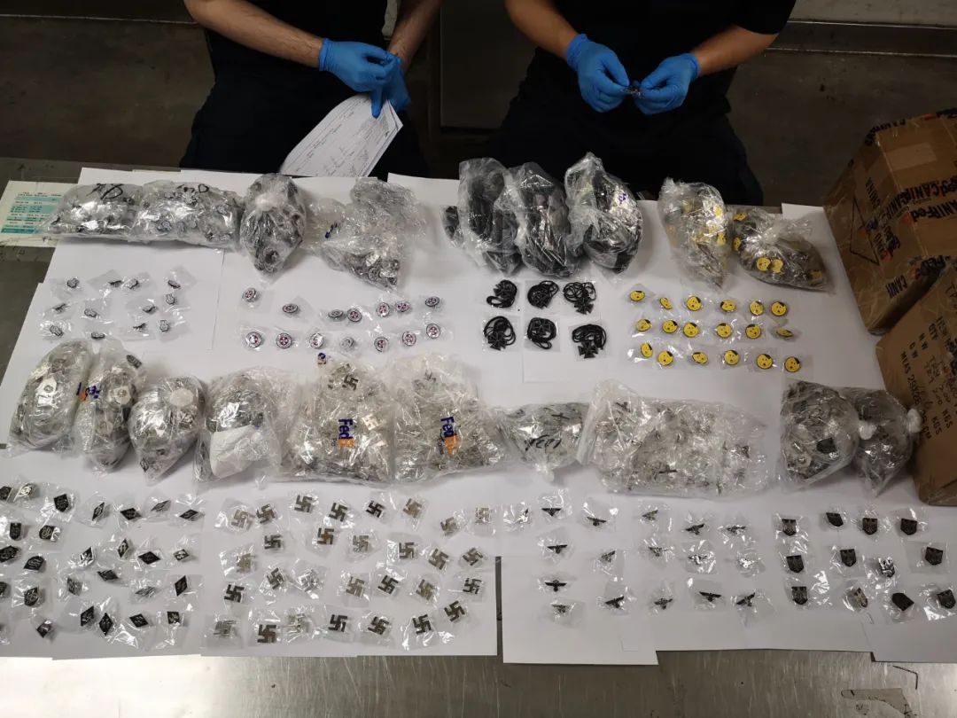 据介绍,广州海关所属广州白云机场海关关员根据风险布控指令对一票出境快件进行监管时,发现该快件X光机过机图像异常,过机图像显示快件内有大量堆叠在一起的“万字符”金属制品,疑似纳粹徽章。经开箱查验,发现箱内装有大量用透明塑料袋简单封装的金属徽章,徽章纳粹特征明显,种类较多,有希特勒卡通头像、纳粹“万字符”、纳粹党徽等9种,共1881枚。