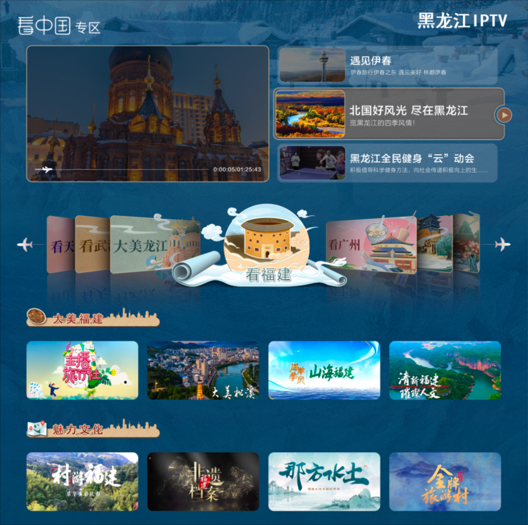 精心准备精品节目资源,打造“五一”节目矩阵。五一期间,各省市IPTV在“看中国”专区持续上新和推荐一大批精品节目及文旅宣传片,如《贵州·一起来看村 BA》《云南·你所未见的云南》《湖南·五千块吃遍湖南》《天津·红色馆藏故事》《西安人的歌》《寻味贵州》《好吃好玩福建见》《北国风光 尽在黑龙江》《书记县长当导游》《九地市一区副市长美食推荐》等极具地方特色的节目。同时,还汇聚播出大量人文、美食、旅游、历史四大类型的优质人文类节目,以及少部分社会生活类、音乐综艺类精品节目,如“看河北”子栏目推送《大河之北》系列及《中国梆子》《中国杂技·吴桥》《大好河山》,“看贵州”子栏目推送《贵州桥是什么?》《朵哩民宿》《檀亭茶室》《糊涂酒业》,“看湖北”子栏目推送《武当神韵》《印象襄阳》《荆品名门》《文旅恩施》,“看云南”子栏目推送《滇越铁路-生命的故事》等。截至目前,IPTV“看中国”专区节目量已累计超3000余个,向全国观众展现各地特色的美食美景和人文风情,送上极具观赏性的假日文化大餐。