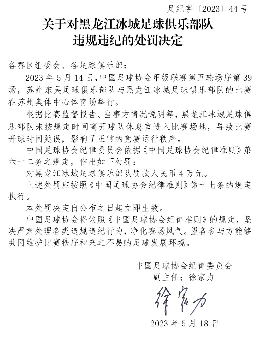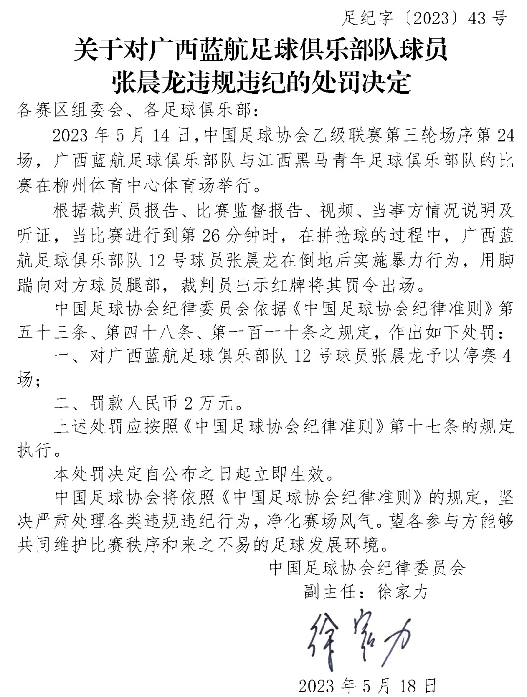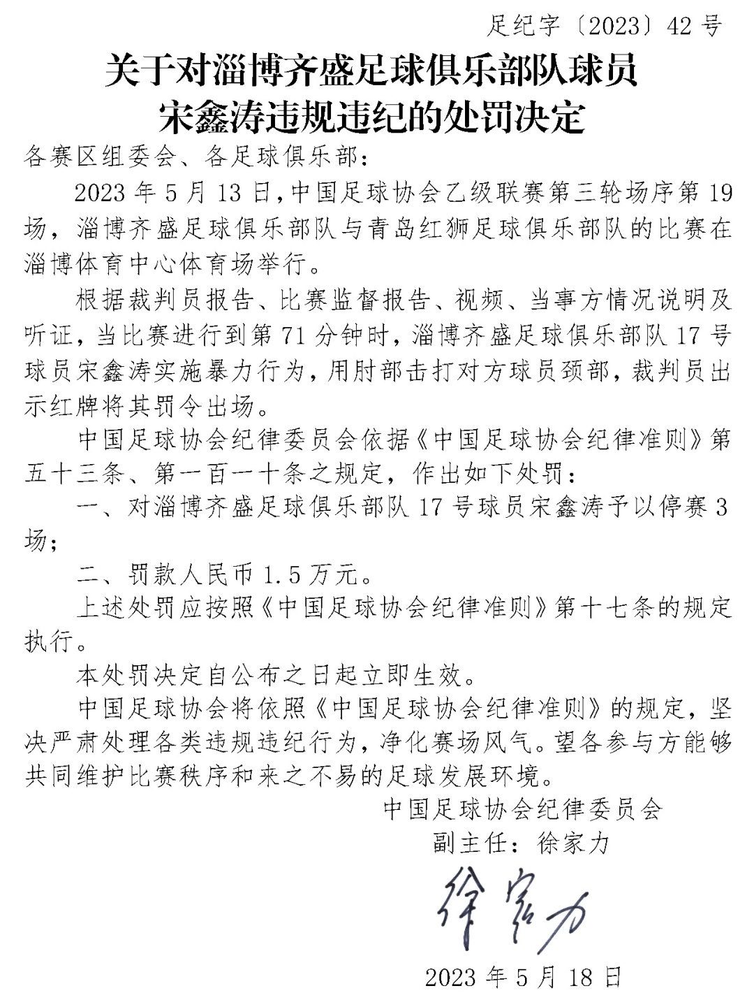 5月18日,中国足协官网连发三份处罚决定,对淄博齐盛足球俱乐部队球员宋鑫涛、广西蓝航足球俱乐部队球员张晨龙和黑龙江冰城足球俱乐部队进行停赛或罚款处罚。详细内容如下: