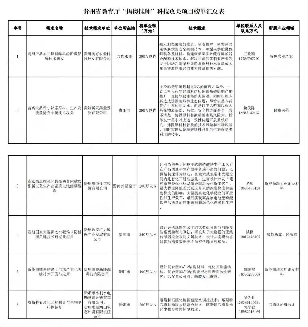省教育厅在前期公开征集技术攻关和成果转化重大需求基础上,聚焦企业创新和重点产业发展需要,遴选了一批“揭榜挂帅”科技攻关项目需求,形成了6项科技攻关榜单,涉及特色农业产业、新能源动力电池及材料、健康医药、大数据、生态环境保护等产业领域的重点需求。