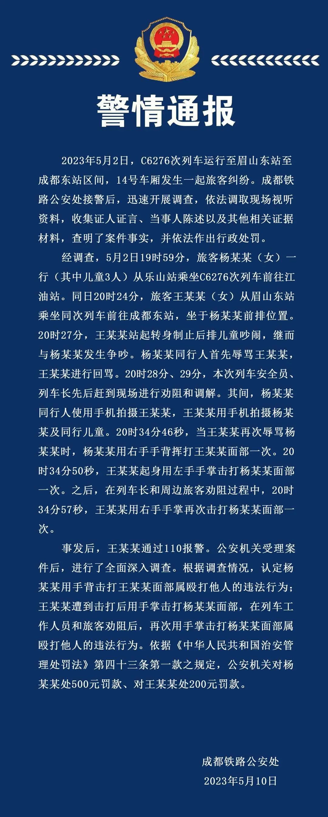 经调查,5月2日19时59分,旅客杨某某(女)一行(其中儿童3人) 从乐山站乘坐C6276次列车前往江油站。同日20时24分,旅客王某某(女)从眉山东站乘坐同次列车前往成都东站,坐于杨某某前排位置。20时27分,王某某站起转身制止后排儿童吵闹,继而与杨某某发生争吵。杨某某同行人首先辱骂王某某,王某某进行回骂。20时28分、29分,本次列车安全员、列车长先后赶到现场进行劝阻和调解。其间,杨某某同行人使用手机拍摄王某某,王某某用手机拍摄杨某某及同行儿童。20时34分46秒,当王某某再次辱骂杨某某时,杨某某用右手手背挥打王某某面部一次。20时34分50秒,王某某起身用左手手掌击打杨某某面部一次。之后,在列车长和周边旅客劝阻过程中,20时34分57秒,王某某用右手手掌再次击打杨某某面部一次。