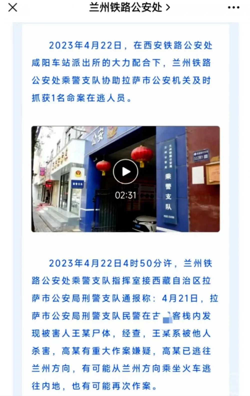 “4时50分许,兰州铁路公安处乘警支队指挥室接拉萨市公安局刑警支队通报称:4月21日,拉萨市公安局刑警支队民警在一客栈内发现被害人王某尸体。经查,王某系被他人杀害,高某有重大作案嫌疑,高某已逃往兰州方向,有可能从兰州方向乘坐火车逃往内地,也有可能再次作案。在咸阳站派出所民警的配合下,成功将其抓获,并从嫌疑人高某身上搜出被害人王某的身份证及苹果手机、银行卡等。”